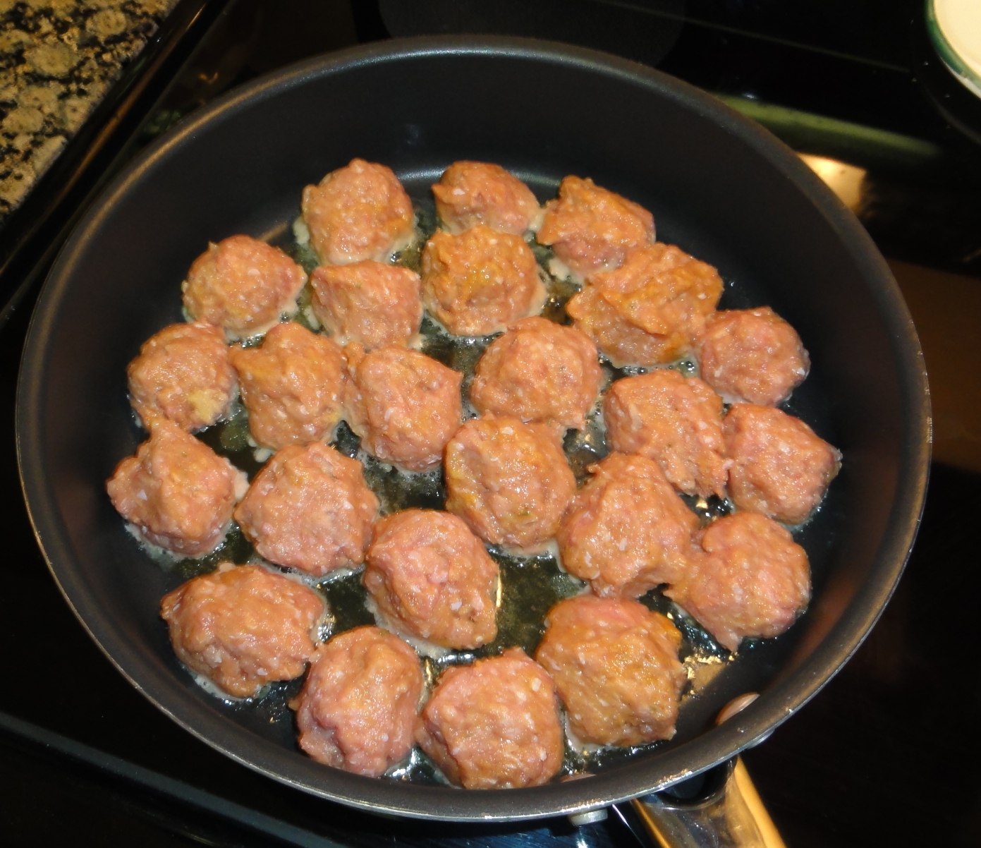 Cook the meatballs in the oil until browned.  Remove the meatballs to drain on a paper towel.
